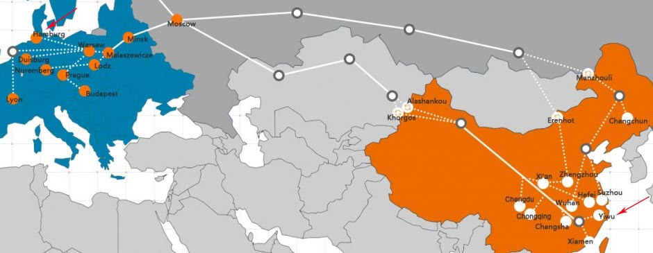 Su carga también puede enviarse por ferrocarril de China a Alemania. El plazo de entrega oscila entre transporte aéreo y marítimo. Depende principalmente de la estación de salida. Por ejemplo, se tarda 11 días de Xi'an a Hamburgo y 18 días de Yiwu a Duisburgo.